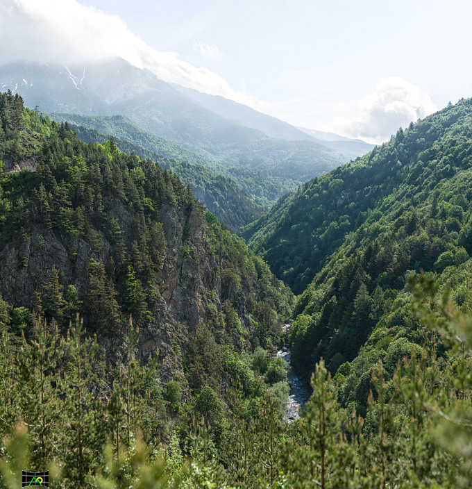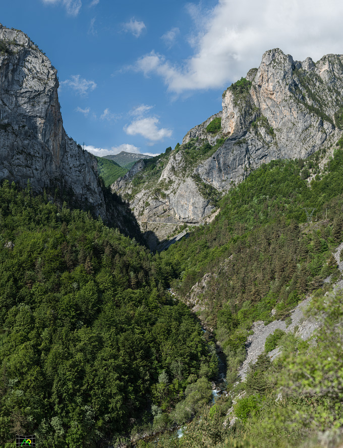 La Gola delle Fascette con sullo sfondo la Cima Missoun. La circolazione idrica nella gola è prevalentemente sotterranea. Le acque del Torrente Negrone entrano nel “Garb del Butaù” per uscirne più a valle attraverso il “Garb d’la Fus”. Solo nel caso di grandi portate idriche si attiva la circolazione superficiale.