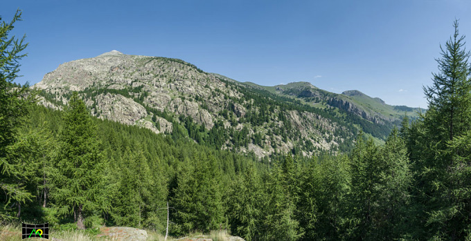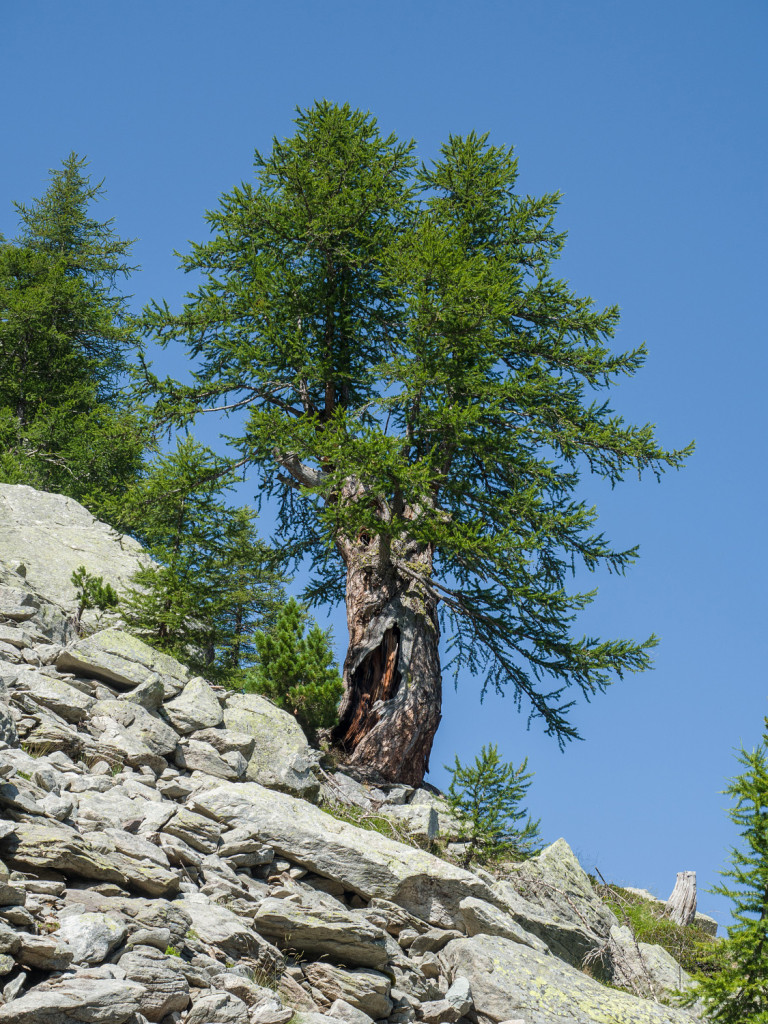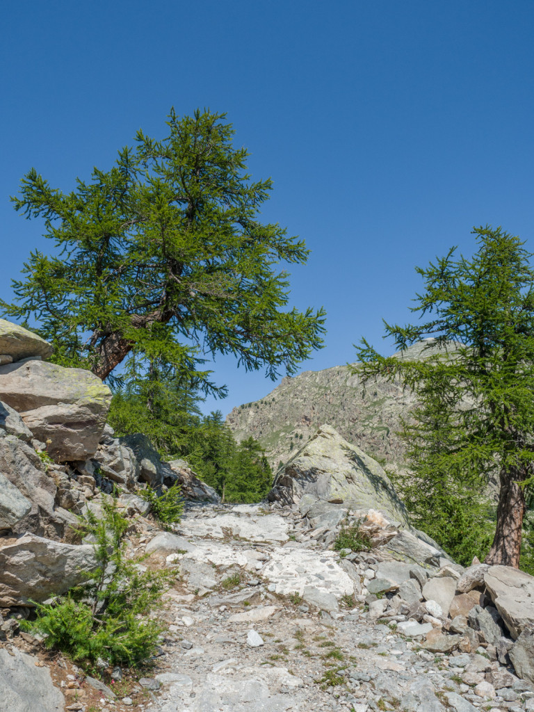 Sulla sommità del vallone la strada passa vicino a moltissimi esemplari di giganteschi larici, oltre questo punto entriamo nel “Bacino dei Laghi Lunghi” (NB: vedi “Valle delle Meraviglie” )