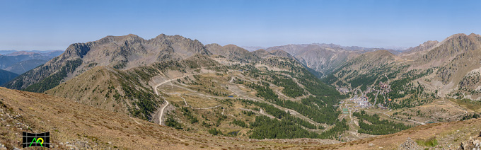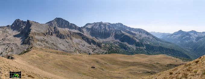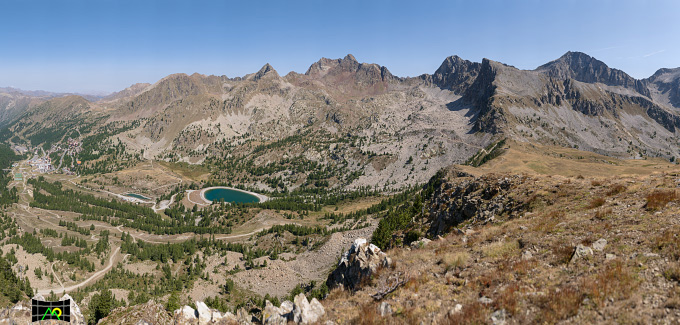 Al centro il vallone de Terre Rouge con sullo sfondo il Monte Malinvern. Isola 2000 è posta all’estrema sinistra della panoramica. Il Lago de Terre Rouge è appena percepibile come una sottile striscia blu posta in corrispondenza della cima del Malinvern.