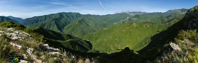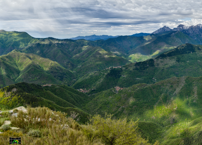 Verso l’alta Valle Argentina. Sono visibili da sinistra i borghi di Andagna, Molini di Triora, Corte e Triora. In Alto la panoramica copre la zona tra il Monte Ceppo e il Monte Pietravecchia