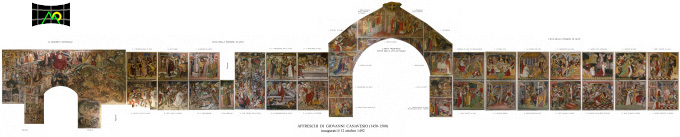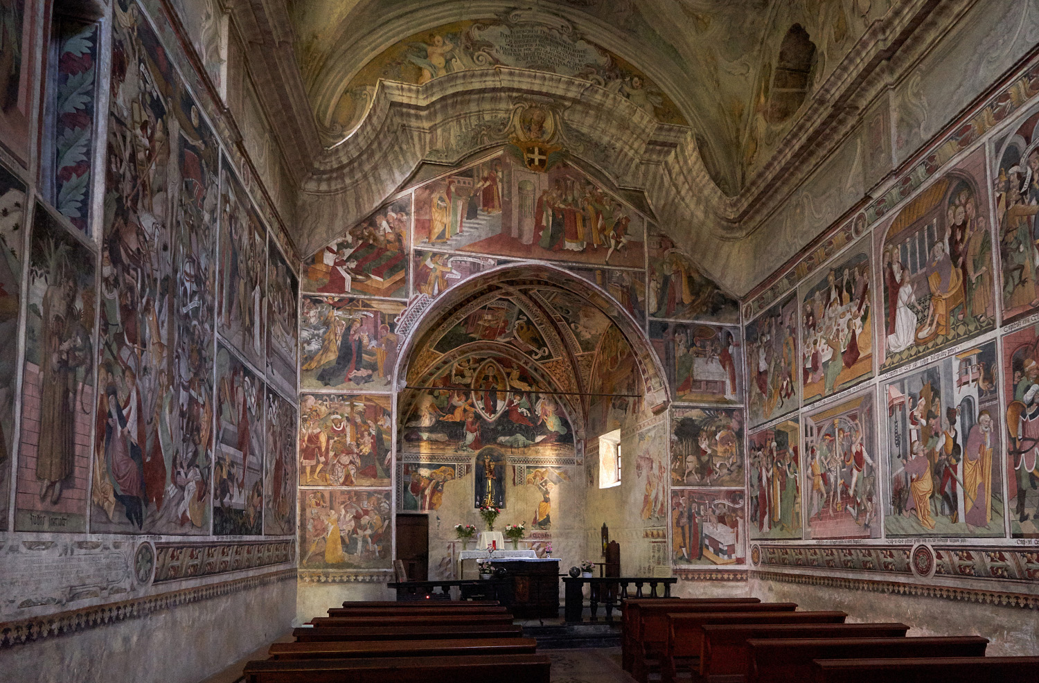 E’ costruita a 4 km. a monte di Briga, sopra un terrapieno sovrastante sette sorgenti. Secondo la tradizione locale le sorgenti si prosciugarono, forse a causa di un evento sismico. I brigaschi invocarono la protezione della Madonna e promisero di costruire in suo onore una cappella. Dopo che le sorgenti ripresero ad alimentare il fiume fu edificata la chiesa in memoria del miracolo. Alla fine del quattrocento l’edificio fu affrescato dai pittori piemontesi Giovanni Baleison, che decorò l’interno del coro, dedicandolo all’Assunzione di Maria in cielo, e Giovanni Canavesio, che affrescò tutte le restanti superfici con l’infanzia e la passione di Cristo e il Giudizio Universale. L’inaugurazione avvenne il 12 ottobre 1492 (giorno di scoperta dell’america). Gli affreschi non sono mai stati ritoccati e sono in uno stato eccezionale di conservazione, tanto da poter essere definita la Cappella Sistina delle Alpi Marittime.
