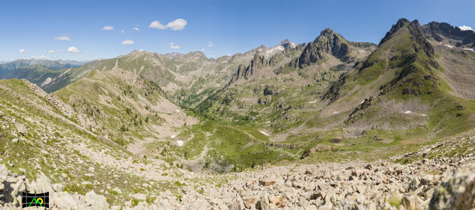 Il vallone del Poncet, ed alla destra della panoramica i Monti Neiglier, Poncet e Gelas. Sul fondo il Colle di Finestra